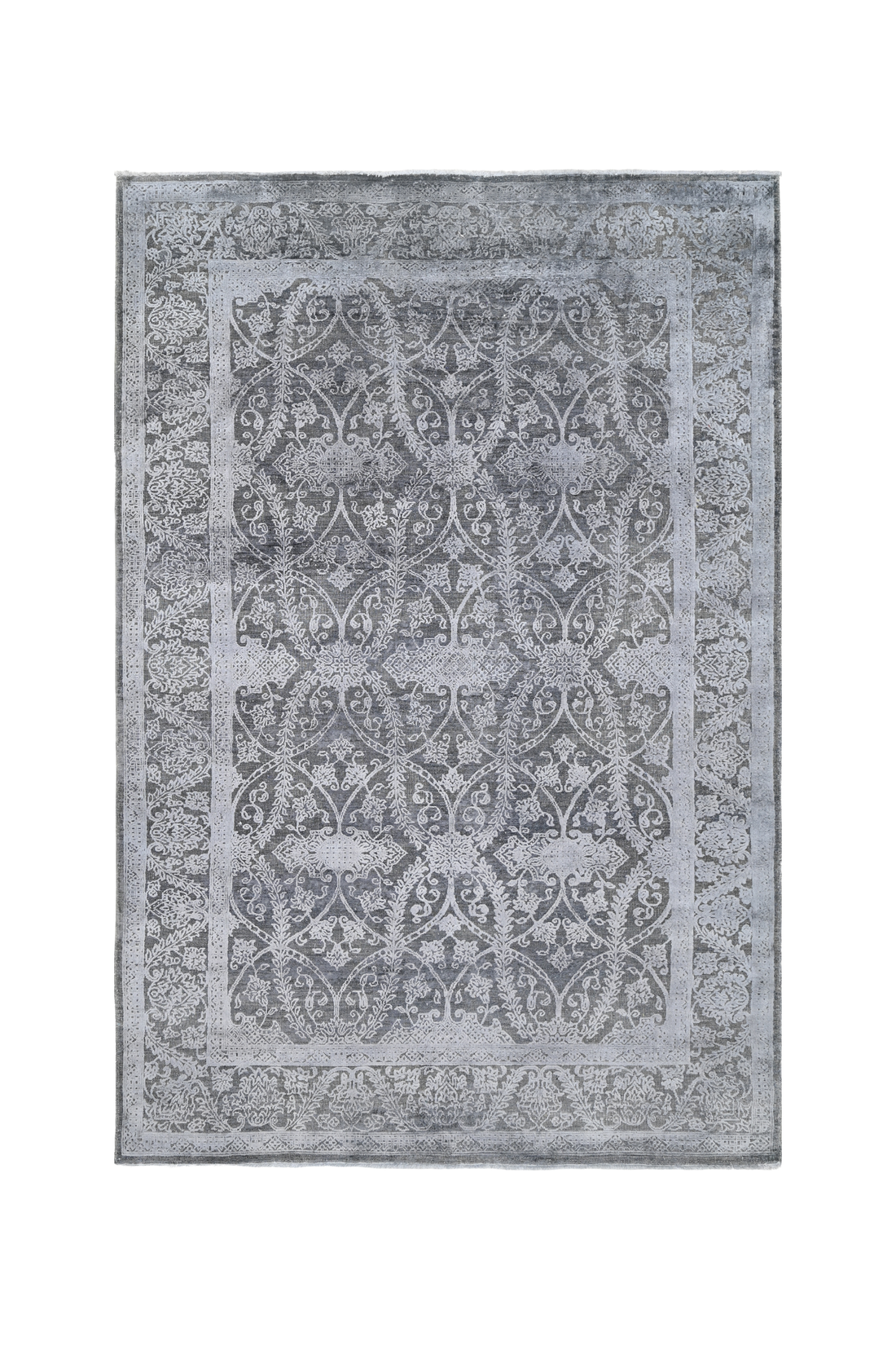 Hand knotted in a blend of fine wool and silk, Charcoal Lattice reinterprets the palmette...