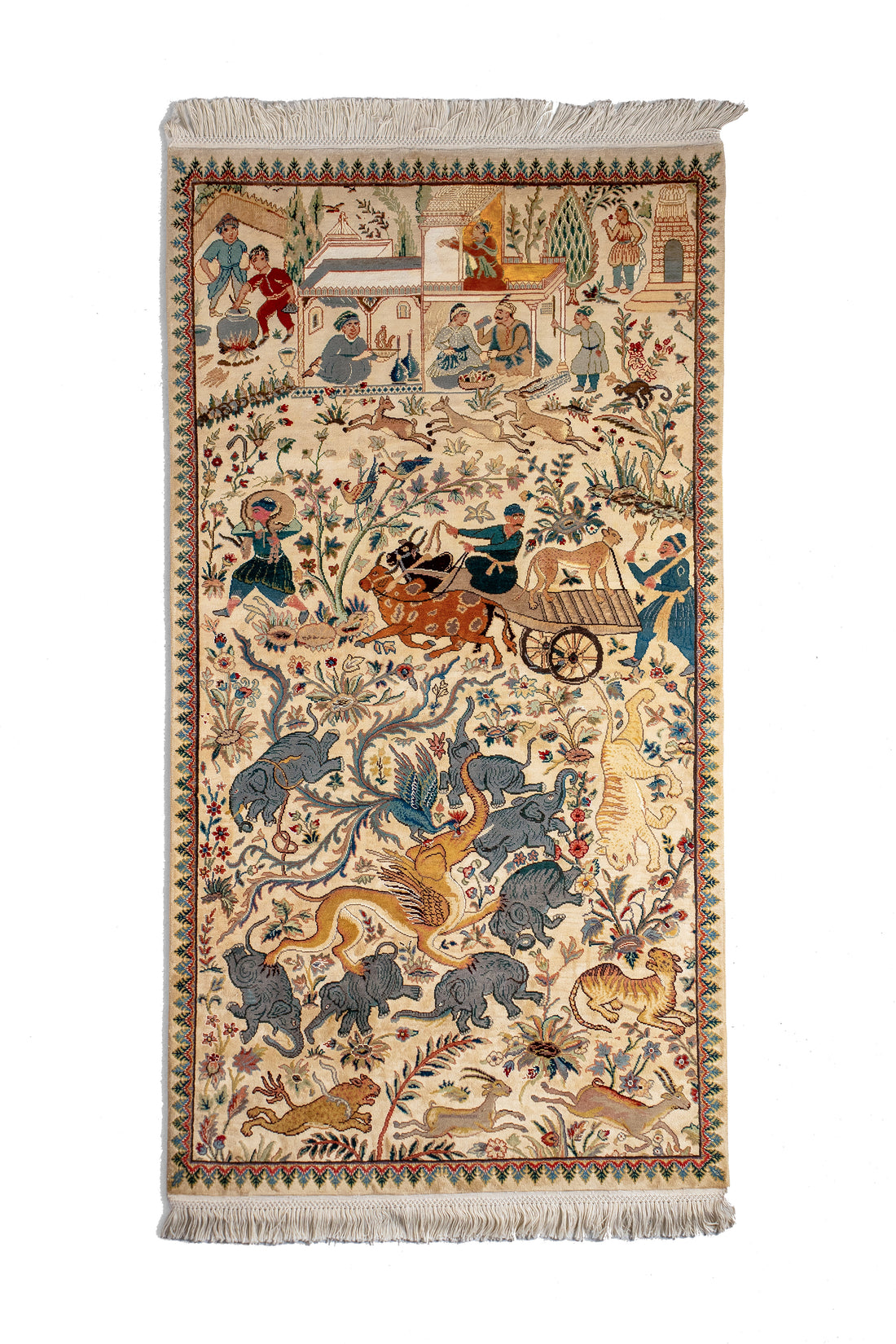 A masterwork of Persian narrative weaving, this exceptional Takht-e-Sulaymani (Throne of Solomon) carpet embodies the...